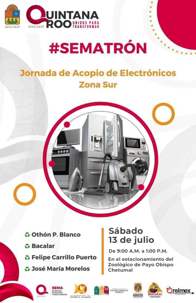 Chetumal.- El Gobierno del Estado a través de la Secretaría de Ecología y Medio Ambiente (SEMA), en coordinación con los municipios de Othón P. Blanco, Bacalar, Felipe Carrillo Puerto y José María Morelos, llevarán a cabo la Jornada de Acopio de Aparatos Electrónicos y Electrodomésticos “Sematrón” el próximo sábado 13 de julio.